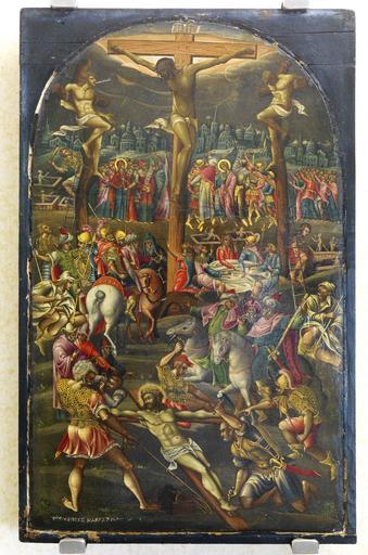 Keywords: Crucifixion by G.Margkazinis (17th c.).jpg Η Σταύρωση μέσα 17ου αιώνα 26x41εκ Γεώργιος αργκαζίνης OPUS GEORGII MARGAZIN Ο ζωγράφος εμ νευσμένος α ό δυτικές χαλκογραφίες έχει συνθέσει μία ρεαλιστική διαδοχή των γεγονότων της Σταύρωσης σε διάφορα ε ί εδα Στο ρώτο ε ί εδο ο σταυρός βρίσκεται στο έδαφος και ένας στρατιώτης καρφώνει τα έλματα του Χριστού ενώ ένας άλλος ετοιμάζει την ανύψωση του σταυρού Πιο ίσω εικονίζεται το λήθος των Εβραίων έφι οι στρατιώτες και άρχοντες Στο κέντρο αριστάνεται ο μεγάλος σταυρός με τον Εσταυρωμένο Χριστό ου λαισιώνεται α ό τους σταυρούς των δύο ληστών Η αγδαληνή γονατισμένη στη βάση του τον αγκαλιάζει με τα χέρια της δί λα εικονίζεται ο διαμερισμός των ιματίων και ιο ίσω η Παναγία με τις γυναίκες ο Ιωάννης και το λήθος ου αρακολουθεί Στο βάθος αριστάνεται η Ιερουσαλήμ σε μικρή κλίμακα τυλιγμένη στο σκοτάδι http //eib xanthi ilsp gr/gr/icons asp mid 17th century Georgios Margkazinis Files uploaded by Shakko from various sources 17th-century icons of Greece Icons of the crucifixion of Christ Cretan School PD-old |