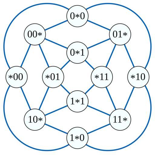 | Keywords: Cube-face-intersection-graph.svg intersection graph of the edges of a cube Equivalently a graph in which the vertices represent two-bit samples of a 3-bit bitstring Induced subgraphs of analogously defined graphs for larger numbers of bits play a key role in proofs of hardness of approximation for the clique problem own http //11011110 livejournal com/167402 html David Eppstein 2009-03-21 Undirected planar graphs Files by User David Eppstein from en wikipedia Graphs with 12 vertices Related to the cube |