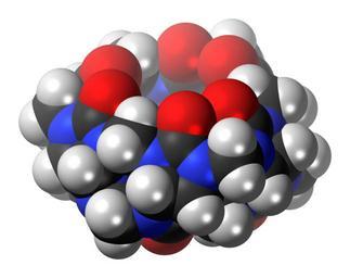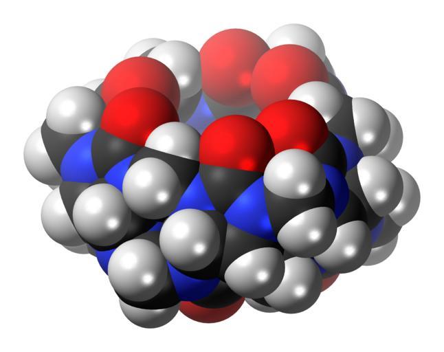 Keywords: Cucurbit(6)uril-(side)-3D-spacefill.png Space-filling model of the Cucurbit6uril molecule one of the cucurbiturils a group of macrocyclic compounds which have many applications in supramolecular chemistry This image shows the side view Colour code 505050 Carbon C black<br> F0F0F0 Hydrogen H white<br> F51E1E Oxygen O red<br> 3C50FA Nitrogen N blue<br> 2011-06-03 own DS Visualizer Jynto talk Top view ball-and-stick version Top view space-filling version Top view stick version Side view ball-and-stick version Side view stick version cc-zero Cucurbiturils Images by Jynto Space-filling models |