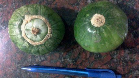 Keywords: Cucurbita maxima Zapallito group blossom end with and without button.jpg es Cucurbita maxima Zapallito Group comprado en un mercado de la ciudad de Buenos Aires a fines de noviembre del 2012 a la izquierda uno con botón o turbantito que el horticultor selecciona negativamente debido a que tiene menos valor comercial 2013-11-27 19 48 45 own RoRo cc-zero Uploaded with UploadWizard Cucurbita maxima zapallito group Unripe fruits of Cucurbitaceae Cultivated Cucurbita of Argentina Images with pens to indicate scale |