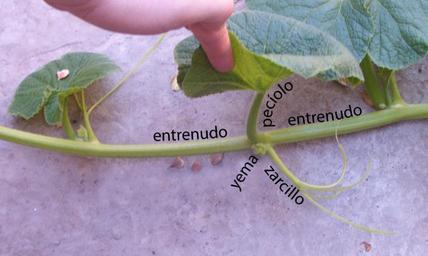 Keywords: Cucurbitaceae - typical vine plant internodes petiole bud tendril around a node spanish labels.svg es Típica planta de guía de cucurbitácea a diferencia de la planta de tronco o compacta o arbustiva de algunos cultivares seleccionados Cucurbita maxima landrace argentina semilla comprada con el nombre comercial zapallo plomo 2013-12-22 18 09 26 own RoRo Cucurbitaceae - typical vine plant internodes jpg cc-zero Cucurbita maxima zapallo plomo Argentina Cucurbita vines Cultivated Cucurbita of Argentina Cucurbita close up of plant parts |