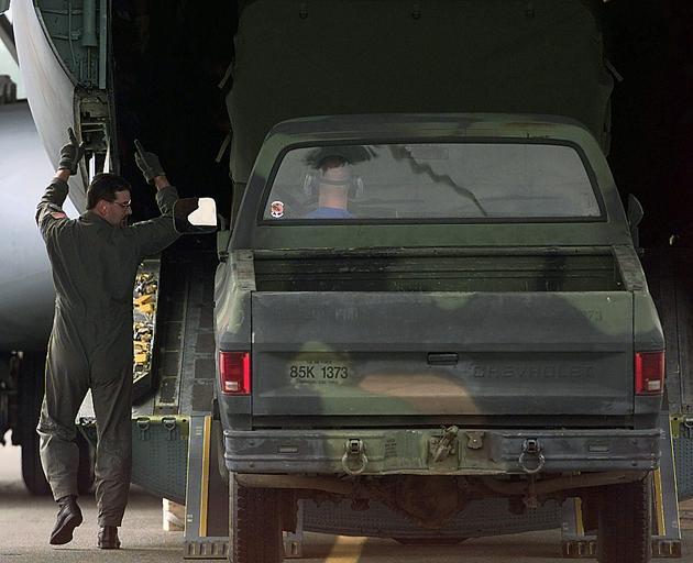 | Keywords: CUCV II Type B Truck loading.jpg A US Air Force USAF C-141B Starlifter aircraft Loadmaster 305th Air Mobility Wing AMW McGuire Air Force Base AFB New Jersey NJ and Rodeo 98 Team member marshals a Commercial Utility Cargo Vehicle CUCV II Type B Truck into the cargo bay of his C-141B during the first half of the Engine Running Onload/Offload ERO competition which is part of the over all USAF AMC sponsored Rodeo 98 airlift competition at McChord AFB Washington WA Location MCCHORD AFB WASHINGTON WA UNITED STATES OF AMERICA USA http //www dodmedia osd mil/ 1998-06-22 SRA JEFFREY ALLEN USAF PD-USGov Chevrolet CUCV McChord Air Force Base Transport of vehicles by Lockheed C-141 Starlifter Air Mobility Rodeo |