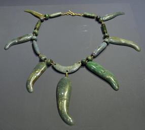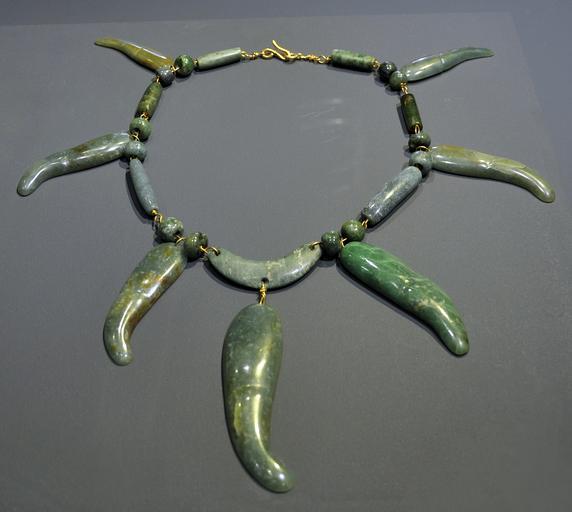 Keywords: Cultures précolombiennes MRAH Olmèque collier jade 02 10 2011.jpg fr Collier en jadéite avec des éléments représentant des griffes de jaguar culture olmèque préclassique moyen 900 - 400 -JC Mexique ou Honduras Musées Royaux d'Art et d'Histoire MRAH Parc du Cinquantenaire Bruxelles 2011-10-02 own Vassil Cc-zero Collection from America Jubilee Park Museum Jadeite Mesoamerican jade jewellery |