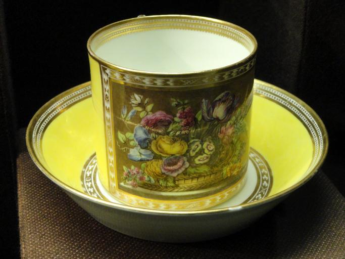 Keywords: Cup and saucer, c. 1794-1795, William Duesbury II & Co., Derby, England, decorator John Brewer, bone ash soft-paste porcelain, overglaze enamels, gilding - Gardiner Museum, Toronto - DSC00807.JPG Exhibit in the Gardiner Museum Toronto Ontario Canada This artwork is in the public domain because the artist died more than 70 years ago Photography was permitted in the museum without restriction Daderot 2012-10-16 15 21 45 Daderot cc0 cc0 William Duesbury porcelain in the Gardiner Museum