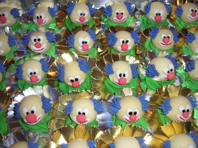 Keywords: cupcakes decorated clown faces food sweet baked party frosting icing gourmet colorful fun