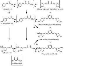 Keywords: Curcumin-2.JPG Curcumin biosynthesis svg en Curcumin biosynthetic route Kita T ; Imai S ; Sawada H ; Kumagai H ; Seto H The biosynthetic pathway of curcuminoid in turmeric Curcuma longa as revealed by 13C-labeled precursors Bioscience Biotechnology and Biochemistry 2008 72 1789-1798 Eric Lachman 12/01/2008 Curcumin Biosyntheses |