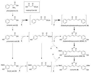Keywords: Curcumin biosynthesis.svg ValidSVG en Curcumin biosynthetic route Own 2011-11-17 06 46 UTC Curcumin-2 JPG Eric Lachman derivative work Charlesy <span class signature-talk >talk</span> Kita T ; Imai S ; Sawada H ; Kumagai H ; Seto H The biosynthetic pathway of curcuminoid in turmeric Curcuma longa as revealed by 13C-labeled pre</nowiki> Uploaded with derivativeFX Biosyntheses Curcumin |