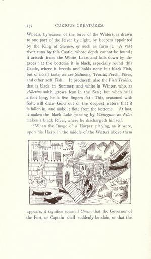 | Keywords: Curious creatures in zoology (14948456623).jpg 2 5 2 <br> CURIOUS CREATURES <br> Wheels by reason of the force of the Waters is drawn <br> to one part of the River by night by keepers appointed <br> by the King of Sweden or such as farm it A vast <br> river runs by this Castle whose depth cannot be found ; <br> it ariseth from the White Lake and falls down by de- <br> grees at the bottome it is black especially round this <br> Castle where it breeds and holds none but black Fish <br> but of no ill taste as are Salmons Trouts Perch Pikes <br> and other soft Fish It produceth also the Fish Trcbius <br> that is black in Summer and white in Winter who as <br> Albertus saith grows lean in the Sea ; but when he is <br> a foot long he is five fingers fat This seasoned with <br> Salt will draw Gold out of the deepest waters that it <br> is fallen in and make it flote from the bottome At last <br> it makes the black Lake passing by Vibiirgum as Nilus <br> makes a black River where he dischargeth himself <br> When the Image of a Harper playing as it were <br> upon his Harp in the middle of the Waters above them <br> appears it signifies some ill Omen that the Governor of <br> the Fort or Captain shall suddenly be slain or that the 23575007 76213 32031 Page 252 Text http //www biodiversitylibrary org/page/23575007 1890 10 5962/bhl title 32031 Ashton John NameFound Albertus NameFound Nilus NameConfirmed Nilus EOLID 113018 NameBankID 4258720 Biodiversity Heritage Library Curious creatures in zoology; with 130 illus throughout the text Monsters Are Real Animals University of California Libraries archive org bhl page 23575007 dc identifier http //biodiversitylibrary org/page/23575007 bhlMonstersRreal Halloween university of california libraries archive org bhlmonstersrreal Information field Flickr posted date ISOdate 2014-10-19 CC-BY-2 0 BioDivLibrary https //flickr com/photos/61021753 N02/14948456623 2015-08-25 20 55 52 cc-by-2 0 PD-old-70-1923 Curious creatures in zoology Photos uploaded from Flickr by Fæ using a script |