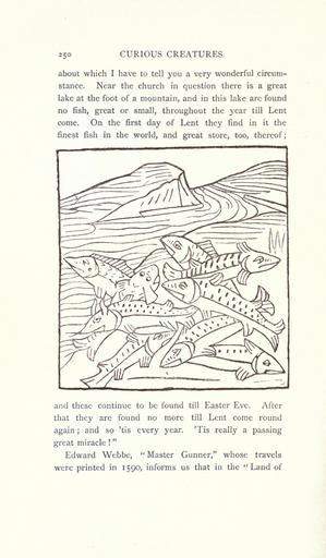 Keywords: Curious creatures in zoology (15382994900).jpg 2 5 o CURIOUS CREATURES <br> about which I have to tell you a very wonderful circum- <br> stance Near the church in question there is a great <br> lake at the foot of a mountain and in this lake arc found <br> no fish great or small throughout the year till Lent <br> come On the first day of Lent they find in it the <br> finest fish in the world and great store too thereof; <br> and these continue to be found till Easter Eve After <br> that they are found no more till Lent come round <br> again ; and so 'tis every year Tis really a passing <br> great miracle <br> Edward Webbe Master Gunner whose travels <br> were printed in 1590 informs us that in the Land of 23575005 76213 32031 Page 250 Text http //www biodiversitylibrary org/page/23575005 1890 10 5962/bhl title 32031 Ashton John Biodiversity Heritage Library Curious creatures in zoology; with 130 illus throughout the text Monsters Are Real Animals University of California Libraries archive org bhl page 23575005 dc identifier http //biodiversitylibrary org/page/23575005 bhlMonstersRreal Halloween university of california libraries archive org bhlmonstersrreal Information field Flickr posted date ISOdate 2014-10-19 CC-BY-2 0 BioDivLibrary https //flickr com/photos/61021753 N02/15382994900 2015-08-25 20 54 24 cc-by-2 0 PD-old-70-1923 Curious creatures in zoology Photos uploaded from Flickr by Fæ using a script |