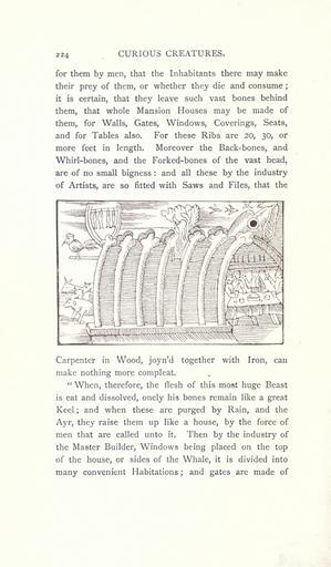 Keywords: Curious creatures in zoology (14948426513).jpg 224 CURIOUS CREATURES <br> for them by men that the Inhabitants there may make <br> their prey of them or whether they die and consume ; <br> it is certain that they leave such vast bones behind <br> them that whole Mansion Houses may be made of <br> them for Walls Gates Windows Coverings Seats <br> and for Tables also For these Ribs are 20 30 or <br> more feet in length Moreover the Back-bones and <br> Whirl-bones and the Forked-bones of the vast head <br> are of no small bigness and all these by the industry <br> of Artists are so fitted with Saws and Files that the <br> Carpenter in Wood joyn'd together with Iron can <br> make nothing more compleat <br> When therefore the flesh of this most huge Beast <br> is eat and dissolved onely his bones remain like a great <br> Keel ; and when these are purged by Rain and the <br> Ayr they raise them up like a house by the force of <br> men that are called unto it Then by the industry of <br> the Master Builder Windows being placed on the top <br> of the house or sides of the Whale it is divided into <br> many convenient Habitations; and gates are made of 23574979 76213 32031 Page 224 Text http //www biodiversitylibrary org/page/23574979 1890 10 5962/bhl title 32031 Ashton John Biodiversity Heritage Library Curious creatures in zoology; with 130 illus throughout the text Monsters Are Real Animals University of California Libraries archive org bhl page 23574979 dc identifier http //biodiversitylibrary org/page/23574979 bhlMonstersRreal Halloween university of california libraries archive org bhlmonstersrreal Information field Flickr posted date ISOdate 2014-10-19 CC-BY-2 0 BioDivLibrary https //flickr com/photos/61021753 N02/14948426513 2015-08-25 20 52 31 cc-by-2 0 PD-old-70-1923 Curious creatures in zoology Photos uploaded from Flickr by Fæ using a script |