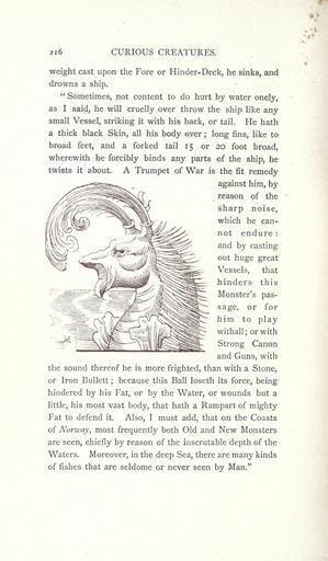 | Keywords: Curious creatures in zoology (14947839234).jpg 216 <br> CURIOUS CREATURES <br> weight cast upon the Fore or Hinder-Deck he sinks and <br> drowns a ship <br> Sometimes not content to do hurt by water onely <br> as I said he will cruelly over throw the ship like any <br> small Vessel striking it with his back or tail He hath <br> a thick black Skin all his body over ; long fins like to <br> broad feet and a forked tail 15 or 20 foot broad <br> wherewith he forcibly binds any parts of the ship he <br> twists it about A Trumpet of War is the fit remedy <br> against him by <br> reason of the <br> sharp noise <br> which he can- <br> not endure <br> and by casting <br> out huge great <br> Vessels that <br> hinders this <br> Monster's pas- <br> sage or for <br> him to play <br> y in <br> and Guns with <br> the sound thereof he is more frighted than with a Stone <br> or Iron Bullett ; because this Ball loscth its force being <br> hindered by his Fat or by the Water or wounds but a <br> little his most vast body that hath a Rampart of mighty <br> Fat to defend it Also I must add that on the Coasts <br> of Norway most frequently both Old and New Monsters <br> are seen chiefly by reason of the inscrutable depth of the <br> Waters Moreover in the deep Sea there are many kinds <br> of fishes that are seldome or never seen by Man 23574971 76213 32031 Page 216 Text http //www biodiversitylibrary org/page/23574971 1890 10 5962/bhl title 32031 Ashton John Biodiversity Heritage Library Leviathans Curious creatures in zoology; with 130 illus throughout the text Monsters Are Real Animals University of California Libraries archive org bhl page 23574971 dc identifier http //biodiversitylibrary org/page/23574971 bhlMonstersRreal Halloween leviathan university of california libraries archive org bhlmonstersrreal Information field Flickr posted date ISOdate 2014-10-19 CC-BY-2 0 BioDivLibrary https //flickr com/photos/61021753 N02/14947839234 2015-08-25 20 56 03 cc-by-2 0 PD-old-70-1923 leviathan Curious creatures in zoology Photos uploaded from Flickr by Fæ using a script |
