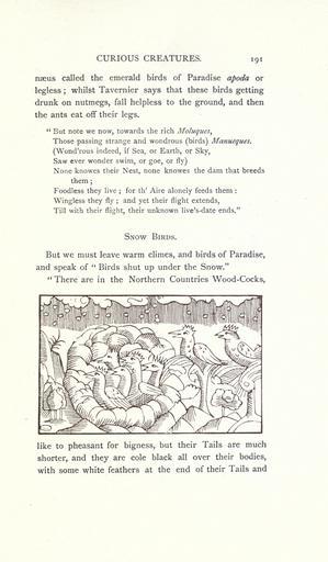 Keywords: Curious creatures in zoology (15382561377).jpg CURIOUS CREATURES 191 <br> naeus called the emerald birds of Paradise apoda or <br> legless ; whilst Tavernier says that these birds getting <br> drunk on nutmegs fall helpless to the ground and then <br> the ants eat off their legs <br> But note we now towards the rich Moluques <br> Those passing strange and wondrous birds Manueques <br> Wond'rous indeed if Sea or Earth or Sky <br> Saw ever wonder swim or goe or fly <br> None knowes their Nest none knowes the dam that breeds <br> them; <br> Foodless they live ; for th' Aire alonely feeds them <br> Wingless they fly ; and yet their flight extends <br> Till with their flight their unknown live's-date ends <br> SNOW BIRDS <br> But we must leave warm climes and birds of Paradise <br> and speak of Birds shut up under the Snow <br> There are in the Northern Countries Wood-Cocks <br> like to pheasant for bigness but their Tails are much <br> shorter and they are cole black all over their bodies <br> with some white feathers at the end of their Tails and 23574946 76213 32031 Page 191 Text http //www biodiversitylibrary org/page/23574946 1890 10 5962/bhl title 32031 Ashton John NameFound None NameConfirmed None EOLID 2913255 Biodiversity Heritage Library Curious creatures in zoology; with 130 illus throughout the text Monsters Are Real Animals University of California Libraries archive org bhl page 23574946 dc identifier http //biodiversitylibrary org/page/23574946 bhlMonstersRreal Halloween university of california libraries archive org bhlmonstersrreal Information field Flickr posted date ISOdate 2014-10-19 CC-BY-2 0 BioDivLibrary https //flickr com/photos/61021753 N02/15382561377 2015-08-25 21 52 31 cc-by-2 0 PD-old-70-1923 Curious creatures in zoology Photos uploaded from Flickr by Fæ using a script |