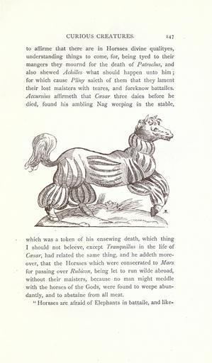Keywords: Curious creatures in zoology (14948372973).jpg CURIOUS CREATURES 147 <br> to affirme that there are in Horsses divine qualityes <br> understanding things to come for being tyed to their <br> mangers they mournd for the death of Patroclus and <br> also shewed Achilles what should happen unto him ; <br> for which cause Pliny saieth of them that they lament <br> their lost maisters with teares and foreknow battailes <br> Accursius affirmeth that Ccesar three daies before he <br> died found his ambling Nag weeping in the stable <br> which was a token of his ensewing death which thing <br> I should not beleeve except Tranquillus in the life of <br> Ccesar had related the same thing and he addeth more- <br> over that the Horsses which were consecrated to Mars <br> for passing over Rubicon being let to run wilde abroad <br> without their maisters because no man might meddle <br> with the horses of the Gods were found to weepe abun- <br> dantly and to abstaine from all meat <br> Horsses are afraid of Elephants in battaile and like- 23574902 76213 32031 Page 147 Text http //www biodiversitylibrary org/page/23574902 1890 10 5962/bhl title 32031 Ashton John NameFound Accursius affirmeth NameFound Patroclus NameConfirmed Patroclus EOLID 12066152 NameBankID 4285700 NameFound Tranquillus Biodiversity Heritage Library Curious creatures in zoology; with 130 illus throughout the text Monsters Are Real Animals University of California Libraries archive org bhl page 23574902 dc identifier http //biodiversitylibrary org/page/23574902 bhlMonstersRreal Halloween university of california libraries archive org bhlmonstersrreal Information field Flickr posted date ISOdate 2014-10-19 CC-BY-2 0 BioDivLibrary https //flickr com/photos/61021753 N02/14948372973 2015-08-25 21 52 22 cc-by-2 0 PD-old-70-1923 Curious creatures in zoology Photos uploaded from Flickr by Fæ using a script |