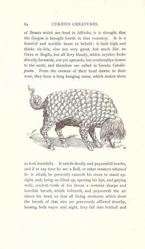 Keywords: Curious creatures in zoology (15565855051).jpg 84 CURIOUS CREATURES <br> of Beasts which are bred in Affricke it is thought that <br> the Gorgon is brought foorth in that countrey It is a <br> feareful and terrible beast to behold it hath high and <br> thicke eie-lids eies not very great but much like an <br> Oxes or Bugils but all fiery bloudy which neyther looke <br> directly forwarde nor yet upwards but continuallye downe <br> to the earth and therefore are called in Greeke Catoble- <br> ponta From the crowne of their head downe to their <br> nose they have a long hanging mane which makes them <br> to look fearefully It eateth deadly and poysonfull hearbs <br> and if at any time he see a Bull or other creature whereof <br> he is afraid he presently causeth his mane to stand up- <br> right and being so lifted up opening his lips and gaping <br> wide sendeth forth of his throat a certaine sharpe and <br> horrible breath which infecteth and poysoneth the air <br> above his head so that all living creatures which draw <br> the breath of that aire are greevously afflicted thereby <br> loosing both voyce and sight they fall into leathall and 23574839 76213 32031 Page 84 Text http //www biodiversitylibrary org/page/23574839 1890 10 5962/bhl title 32031 Ashton John Biodiversity Heritage Library Curious creatures in zoology; with 130 illus throughout the text Monsters Are Real Animals University of California Libraries archive org bhl page 23574839 dc identifier http //biodiversitylibrary org/page/23574839 bhlMonstersRreal Halloween university of california libraries archive org bhlmonstersrreal Information field Flickr posted date ISOdate 2014-10-19 CC-BY-2 0 BioDivLibrary https //flickr com/photos/61021753 N02/15565855051 2015-08-25 21 51 42 cc-by-2 0 PD-old-70-1923 Curious creatures in zoology Photos uploaded from Flickr by Fæ using a script |