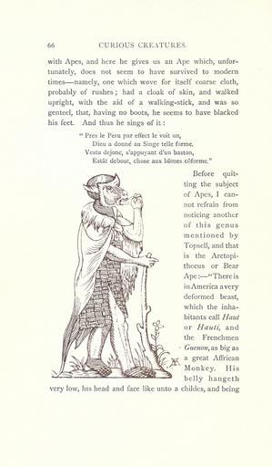 Keywords: Curious creatures in zoology (15568512905).jpg CURIOUS CREATURES <br> with Apes and here he gives us an Ape which unfor- <br> tunately does not seem to have survived to modern <br> times namely one which wove for itself coarse cloth <br> probably of rushes; had a cloak of skin and walked <br> upright with the aid of a walking-stick and was so <br> genteel that having no boots he seems to have blacked <br> his feet And thus he sings of it <br> Pres le Peru par effect le voit on <br> Dieu a donne au Singe telle forme <br> Vestu dejonc s'appuyant d'un baston <br> Estat debout chose aux homes coforme <br> Before quit- <br> ting the subject <br> of Apes I can- <br> not refrain from <br> noticing another <br> of this genus <br> mentioned by <br> Topsell and that <br> is the Arctopi- <br> thecus or Bear <br> Ape There is <br> in America a very <br> deformed beast <br> which the inha- <br> bitants call Haul <br> or Hauti and <br> the Frenchmen <br> Guenon as big as <br> a great Affrican <br> Monkey His <br> belly hangeth <br> very low his head and face like unto a childes and being 23574821 76213 32031 Page 66 Text http //www biodiversitylibrary org/page/23574821 1890 10 5962/bhl title 32031 Ashton John Biodiversity Heritage Library Curious creatures in zoology; with 130 illus throughout the text Monsters Are Real Animals University of California Libraries archive org bhl page 23574821 dc identifier http //biodiversitylibrary org/page/23574821 bhlMonstersRreal Halloween university of california libraries archive org bhlmonstersrreal Information field Flickr posted date ISOdate 2014-10-19 CC-BY-2 0 BioDivLibrary https //flickr com/photos/61021753 N02/15568512905 2015-08-25 21 54 45 cc-by-2 0 PD-old-70-1923 Curious creatures in zoology Photos uploaded from Flickr by Fæ using a script |