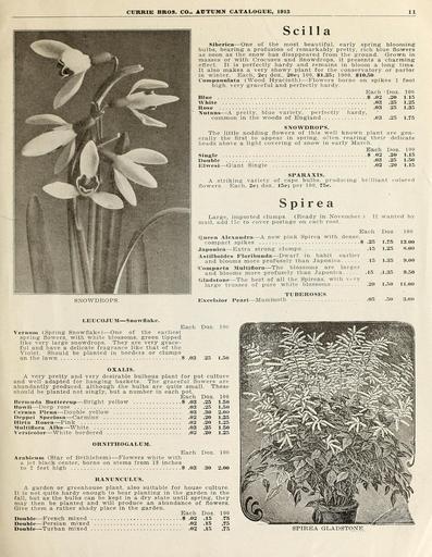 Keywords: Currie's bulbs and plants (Page 11) (16436863692).jpg CURRIE BROS CO AUTUMN CATALOGUE 1913 <br> 11 <br> Sci 1 1 a <br> SNOWDROPS <br> Sibericu One of the most beautiful early spring blooming <br> bulbs bearing a profusion of remarkably pretty rich blue flowers <br> as soon as the snow has disappeared from the ground Grown in <br> masses or with Crocuses and Snowdrops it presents a charming <br> effect It is perfectly hardy and remains in bloom a long time <br> It also makes a very showy plant for the conservatory or parlor <br> in winter Each 2c; doz 20c; 100 1 35; 1000 10 50 <br> Companulata Wood Hyacinth Flowers borne on spikes 1 foot <br> high very graceful and perfectly hardy <br> Each 'Doz 100 <br> Blue 02 20 1 15 <br> White i 03 25 1 25 <br> Rose 03 25 1 35 <br> Nutans A pretty blue variety perfectly hardy <br> common in the woods of England 03 25 1 75 <br> SNOWDROPS <br> The little nodding flowers of this well known plant are gen- <br> erally the first to appear in spring often rearing their delicate <br> heads above a light covering of snow in early March <br> Each Doz 100 <br> Single 02 20 1 15 <br> Double 03 25 1 50 <br> Elwesi Giant Single 02 20 1 15 <br> SPARAXIS <br> A striking variety of cape bulbs producing' brilliant colored <br> flowers Each 2c; doz 15c; per 100 75c <br> S pir e a <br> Large imported clumps Ready in November If wanted by <br> mail add 15c to cover postage on each root <br> Each Doz 100 <br> Queen Alexandra A new pink Spirea with dense <br> compact spikes ; 25 1 75 13 00 <br> Japonica Extra strong clumps 15 1 25 8 00 <br> Astilboides Floribunda Dwarf in habit earlier <br> and blooms more profusely than Japonica 15 1 35 9 00 <br> Compacta Multiflora The blossoms are larger <br> and blooms more profusely than Japonica 15 1 35 9 50 <br> Gladstone The best of all the Spireas with very <br> large trusses of pure white blossoms 20 1 50 11 00 <br> TUBEROSES <br> Excelsior Pearl Mammoth 05 50 3 00 <br> LEUCOJUM Snowflake <br> Each Doz 100 <br> Vernum Spring Snowflake One of the earliest <br> spring flowers with white blossoms green tipped <br> like very large snowdrops They are very grace- <br> ful and have a delicate fragrance like that of the <br> Violet Should be planted in borders or clumps <br> on the lawn 03 25 1 50 <br> OXALIS <br> A very pretty and very desirable bulbous plant for pot culture <br> and well adapted for hanging baskets The graceful flowers are <br> abundantly produced although the bulbs are quite small These <br> should be planted not singly but a number in each pot <br> Each Doz 100 <br> Bermuda Buttercup Bright yellow 03 25 1 50 <br> llOYvii Deep rose 03 25 1 50 <br> Cernua Plena Double yellow 03 30 2 00 <br> Deppei Speciosa Carmine 02 20 1 25 <br> Hirta Rosea Pink 02 20 1 25 <br> Multiflora Alba White 03 25 1 50 <br> Versicolor White bordered 02 20 1 25 <br> ORNITHOGALUM <br> Each Doz 100 <br> Arabicum Star of Bethlehem Flowers white with <br> a jet black center borne on stems from 18 inches <br> to 2 feet high 03 30 2 00 <br> RANUNCULUS <br> A garden or greenhouse plant also suitable for house culture <br> It is not quite hardy enough to bear planting in the garden in the <br> fall but as the bulbs can be kept in a dry state until spring they <br> may then be planted and will produce an abundance of flowers <br> Give them a rather shady place in the garden <br> Each Doz 100 <br> Double French mixed 02 15 75 <br> Double Persian mixed 02 15 75 <br> Double Turban mixed 02 15 75 <br> SPIREA GLADSTONE 42159895 132797 65947 Page 11 Text http //www biodiversitylibrary org/page/42159895 1913 10 5962/bhl title 65947 Currie Brothers Company ; Henry G Gilbert Nursery and Seed Trade Catalog Collection NameFound Arabicum NameFound Astilboides NameConfirmed Astilboides EOLID 2886988 NameBankID 1812470 NameFound Cernua NameConfirmed Cernua EOLID 4578743 NameBankID 176392 NameFound Compacta NameConfirmed Compacta EOLID 10934908 NameBankID 2627020 NameFound Floribunda NameConfirmed Floribunda EOLID 5190123 NameBankID 3474597 NameFound Leucojum NameConfirmed Leucojum EOLID 29163 NameBankID 2665237 NameFound Multiflora NameConfirmed Multiflora Small J M MacDougal Feuillet supersect NameBankID 9260529 NameFound Ornithogalum NameConfirmed Ornithogalum L EOLID 29231 NameFound Oxalis NameConfirmed Oxalis sect Pseudobulbosae Norlind EOLID 40270 NameFound Ranunculus NameConfirmed Ranunculus EOLID 37662 NameBankID 2576523 NameFound Sparaxis NameConfirmed Sparaxis Ker-Gawl EOLID 38091 NameFound Speciosa NameConfirmed Speciosa NameBankID 5330982 NameFound Vernum Biodiversity Heritage Library Currie's bulbs and plants autumn 1913 new album Garden Stories Bulbs Plants Catalogs Flowers Nurseries Horticulture Plants Ornamental Seeds U S Department of Agriculture National Agricultural Library bhl page 42159895 dc identifier http //biodiversitylibrary org/page/42159895 bhlGardenStories snowdrops spirea BHLinbloom bulbs plants nurseries horticulture plants ornamental u s department of agriculture national agricultural library bhlgardenstories bhlinbloom Information field Flickr posted date ISOdate 2015-02-03 Check categories 2015 September 17 PD-old-70-1923 1913 books Currie's bulbs and plants Photos uploaded from Flickr by FĂŚ using a script Files from the Biodiversity Heritage Library released as Attribution-NonCommercial-ShareAlike |