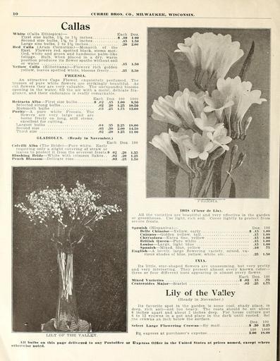 MAKE A MEME View Large Image Currie's bulbs and plants (Page 10) (16250142918).jpg 10 <br> CURRIE BROS CO MILWAUKEE WISCONSIN <br> Callas <br> White Calla Ethiopica ” Each Doz <br> First size bulbs 1 4 to 1 inches 10 1 00 <br> Second size bulbs 1 to 2 inches 15 1 50 ...