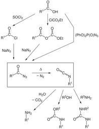Keywords: Curtius rearrangement overview v1.svg en Overview of the Curtius rearrangement de à berblick der Curtius-Reaktion selbst erstellt mit ChemBioOffice 11 LinuxCLP 2011-08-12 Cc-zero Curtius rearrangement