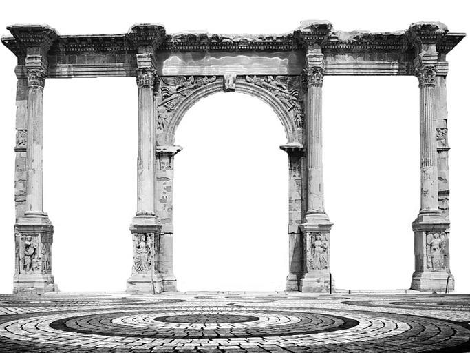 Keywords: cutout background backdrop architecture classical triumphal arch mosaic pattern pavement ancient historic black white gray outdoors scenic place