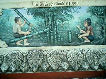 Keywords: Cutting bamboo.JPG ไม่ ห็นน้ำอย่า พ้อตัดกระบอก -- Illustrated Proverb Don't cut bamboo without first checking for thorns Phra That Phanom chedi Amphoe That Phanom Nakhon Phanom Province northeastern Thailand 2004-06-21 Pawyi Lee Public domain Bamboo in art Reliefs in Thailand Wat Phra Tat Phanom Thai proverbs |