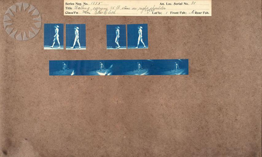 Keywords: photography physics inventors muybridge smithsonian probably public domain probablypublicdomain SI Neg. 2004-41222. Date: na....Title: "Walking carrying 75 lb. stone on right shoulder.".Series Neg. No. 1355.An. Loc. Serial No. 31.Classification: "Man Pelvis Cloth"..Muybridge's cyanotypes are working proofs, the contact prints he made from more than 20,000 negatives he took at the University of Pennsylvania between 1884 and 1886 while photographing human and animal subjects in motion from lateral (parallel), front and rear positions. Since the original negatives no longer exist, the cyanotypes provide us with the opportunity to see the pictures Muybridge achieved before he edited and cropped them for publication..From the Photographic History Collection, National Museum of American History...Credit: Eadweard Muybridge (Smithsonian Institution) SI Neg. 2004-41222. Date: na....Title: "Walking carrying 75 lb. stone on right shoulder.".Series Neg. No. 1355.An. Loc. Serial No. 31.Classification: "Man Pelvis Cloth"..Muybridge's cyanotypes are working proofs, the contact prints he made from more than 20,000 negatives he took at the University of Pennsylvania between 1884 and 1886 while photographing human and animal subjects in motion from lateral (parallel), front and rear positions. Since the original negatives no longer exist, the cyanotypes provide us with the opportunity to see the pictures Muybridge achieved before he edited and cropped them for publication..From the Photographic History Collection, National Museum of American History...Credit: Eadweard Muybridge (Smithsonian Institution) |