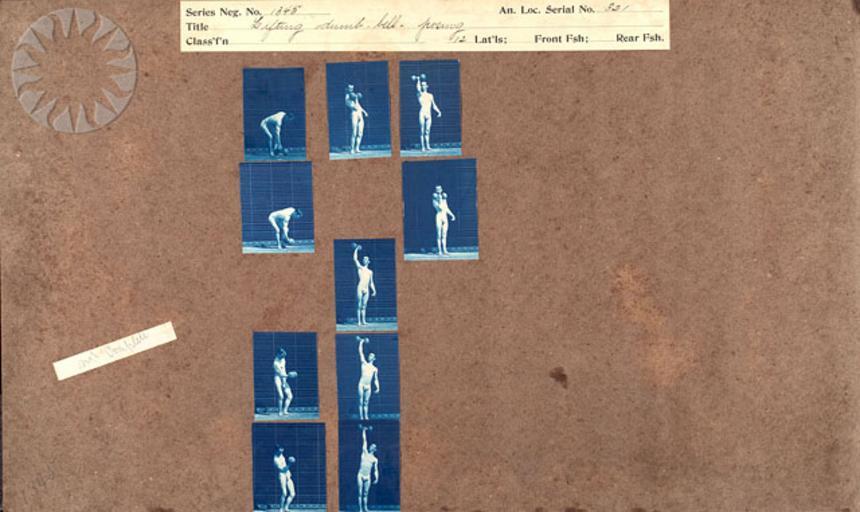 Keywords: photography physics inventors muybridge smithsonian probably public domain probablypublicdomain SI Neg. 2004-47409. Date: na....Title: "Lifting dumb-bell posing.".Series Neg. No. 1345.An. Loc. Serial No. 321.Classification: "None.".Muybridge's cyanotypes are working proofs, the contact prints he made from more than 20,000 negatives he took at the University of Pennsylvania between 1884 and 1886 while photographing human and animal subjects in motion from lateral (parallel), front and rear positions. Since the original negatives no longer exist, the cyanotypes provide us with the opportunity to see the pictures Muybridge achieved before he edited and cropped them for publication..From the Photographic History Collection, National Museum of American History...Credit: Eadweard Muybridge (Smithsonian Institution) SI Neg. 2004-47409. Date: na....Title: "Lifting dumb-bell posing.".Series Neg. No. 1345.An. Loc. Serial No. 321.Classification: "None.".Muybridge's cyanotypes are working proofs, the contact prints he made from more than 20,000 negatives he took at the University of Pennsylvania between 1884 and 1886 while photographing human and animal subjects in motion from lateral (parallel), front and rear positions. Since the original negatives no longer exist, the cyanotypes provide us with the opportunity to see the pictures Muybridge achieved before he edited and cropped them for publication..From the Photographic History Collection, National Museum of American History...Credit: Eadweard Muybridge (Smithsonian Institution) |