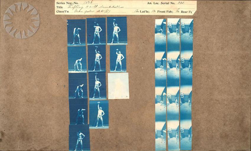 Keywords: photography physics inventors muybridge smithsonian probably public domain probablypublicdomain SI Neg. 2004-44728. Date: na....Title: "Lifting 50 lb. dumb bell.".Series Neg. No. 1036.An. Loc. Serial No. 320.Classification: "Man pelvis cloth (5).".Muybridge's cyanotypes are working proofs, the contact prints he made from more than 20,000 negatives he took at the University of Pennsylvania between 1884 and 1886 while photographing human and animal subjects in motion from lateral (parallel), front and rear positions. Since the original negatives no longer exist, the cyanotypes provide us with the opportunity to see the pictures Muybridge achieved before he edited and cropped them for publication..From the Photographic History Collection, National Museum of American History...Credit: Eadweard Muybridge (Smithsonian Institution) SI Neg. 2004-44728. Date: na....Title: "Lifting 50 lb. dumb bell.".Series Neg. No. 1036.An. Loc. Serial No. 320.Classification: "Man pelvis cloth (5).".Muybridge's cyanotypes are working proofs, the contact prints he made from more than 20,000 negatives he took at the University of Pennsylvania between 1884 and 1886 while photographing human and animal subjects in motion from lateral (parallel), front and rear positions. Since the original negatives no longer exist, the cyanotypes provide us with the opportunity to see the pictures Muybridge achieved before he edited and cropped them for publication..From the Photographic History Collection, National Museum of American History...Credit: Eadweard Muybridge (Smithsonian Institution) |