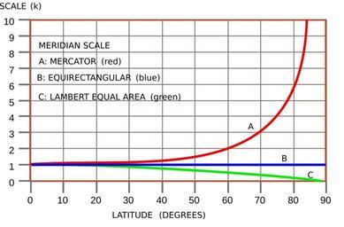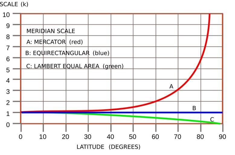 Keywords: Cyl proj scale 3examples.svg en Shows the meridian scale factor for three cylindrical projections Mercator Equirectangular Lambert equal area The Mercator scale factor is istropic so the parallel scale for Mercator is given by the same graph Since all cylindrical projections have the same parallel scale factor this applies to the other two projections own Peter Mercator Cylindrical projection SVG charts in English Lambert cylindrical equal-area projection Mercator projections Equirectangular projection |