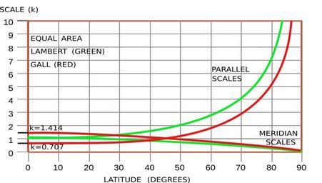 Keywords: Cyl proj scale Lambert Gall.svg en The Lambert and Gall are equal area projections The green curves commencing at k 1 are for the Lambert the parallel scale k increases from k 1 at the equator to infinity at the pole and the meridian scale decreases from 1 at the equator to zero at the pole The product hk 1 guarantees equal area In the Gall red the parallel scale increases to infinity from k 0 707 at the equator and the meridian scale decreases from k 1 414 at the equator to zero at the pole Both Gall scales are equal h k 1 on the standard parallel defined by k 1 at a latitude of 45 degrees own Peter Mercator Cylindrical projection SVG charts in English Lambert cylindrical equal-area projection Gall-Peters projection |