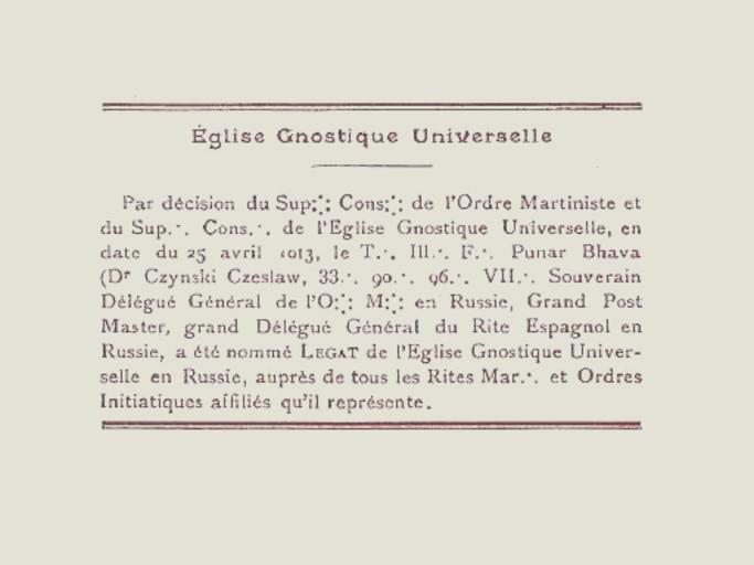 | Keywords: Czy1.jpg О дена ма тинистов и Ве ховного Совета Гностической Католической це кви 25 ап еля 1913 года Высокоп освещенный Б ат Пуна Бхава Чинский Чеслав 33 90 96 VII Де жавный гене альный п едставитель О дена ма тинистов в России Великий Смот итель и великий Гене альный п едставитель Испанского устава в России назначается Посланником Гностической Католической це кви в России и п едставителем а тинистского устава и одственных последнему посвятительных о денов 1913 http //oto ru/cgi-bin/article pl articles/order/history/prinke txt < Жу нал ма тинистов гностических це квей O T O и д Mysteria II 1 6 Па иж июнь 1913 г ст 191 жу нал Mysteria PD-Art Uploaded with UploadWizard Czeslaw Czynski Ordo Templi Orientis Misteria magazine |