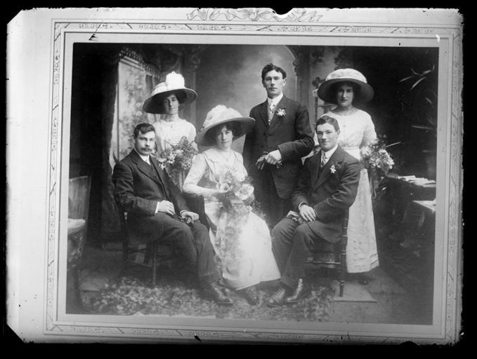 Keywords: proni cooper h.f. cooper hfcooper family family portrait familyportrait genealogy ancestry ulster strabane northern ireland northernireland county tyrone countytyrone lifford county donegal countydonegal blackandwhite picture frame monochrome photo border people wedding surreal black and white Creator: H.F. Cooper Photographer, Strabane Date: c.1900 Original Format: Glass Plate Negative Description: Photograph of an earlier group portrait photo (frame is visible) of three women and three men. PRONI Ref: D1422/B76301/H/6 Copying and copyright: Please see www.proni.gov.uk/index/research_and_records_held/copying_... For Copy Orders, contact: Email: proni@dcalni.gov.uk For fees and charges see: www.proni.gov.uk/index/about_proni/are_there_any_fees_and... Creator: H.F. Cooper Photographer, Strabane Date: c.1900 Original Format: Glass Plate Negative Description: Photograph of an earlier group portrait photo (frame is visible) of three women and three men. PRONI Ref: D1422/B76301/H/6 Copying and copyright: Please see www.proni.gov.uk/index/research_and_records_held/copying_... For Copy Orders, contact: Email: proni@dcalni.gov.uk For fees and charges see: www.proni.gov.uk/index/about_proni/are_there_any_fees_and...