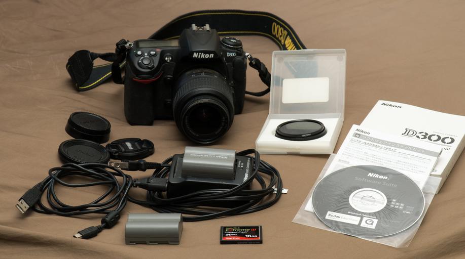 | Keywords: D300 with 18-55mm lens and accessories.jpg en A Nikon 300 with Nikon 18-55mm f/3 5-5 6G AF-S DX VR Nikkor Zoom Lens kit lens pictured with several accessories including 16 GB SanDisk Extreme III CompactFlash memory card 30 MB/s B+W 52mm MRC UV filter on lens B+W 52mm circular polarizing lens filter for diminishing glare MH-18a battery charger Two Nikon batteries EN-EL3e USB cable for transferring images from camera to PC original D300 user manual and software 2012-07-20 own Dcoetzee cc-zero Uploaded with UploadWizard Nikon D300 Camera accessories Photographic filters Flash memory Rechargeable batteries Battery chargers USB cables User's manuals CD-ROM AF-S DX Nikkor 18-55mm f/3 5-5 6G VR |