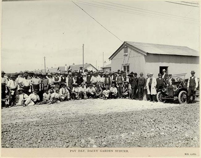 Keywords: archives state records nsw staterecordsnsw newsouthwales blackandwhite daceyville suburb garden suburb gardensuburb sydney people builders public housing publichousing srnsw:series=5225 outdoor black and white Pay day, Dacey Garden suburb Dated: No date Digital ID: 5225_a018_a018000003 Rights: www.records.nsw.gov.au/about-us/rights-and-permissions We'd love to hear from you if you use our photos. From a series of photographs of 'Dacey Garden Suburb' (Daceyville) - a development by the Housing Board of NSW as Sydney's "first planned modern garden suburb". Daceyville was developed between 1913 and 1918 and is located in south-eastern Sydney within the municipalities of Mascot and Botany. The images in the series show scenes of the area before development, road building, the types of houses built, shops, as well as the Public School. The suburb was named after the state parliamentarian John Rowland Dacey who played a vital role in the approval of this urban development. Many other photos in our collection are available to view and browse on our website using Photo Investigator. Pay day, Dacey Garden suburb Dated: No date Digital ID: 5225_a018_a018000003 Rights: www.records.nsw.gov.au/about-us/rights-and-permissions We'd love to hear from you if you use our photos. From a series of photographs of 'Dacey Garden Suburb' (Daceyville) - a development by the Housing Board of NSW as Sydney's "first planned modern garden suburb". Daceyville was developed between 1913 and 1918 and is located in south-eastern Sydney within the municipalities of Mascot and Botany. The images in the series show scenes of the area before development, road building, the types of houses built, shops, as well as the Public School. The suburb was named after the state parliamentarian John Rowland Dacey who played a vital role in the approval of this urban development. Many other photos in our collection are available to view and browse on our website using Photo Investigator. |