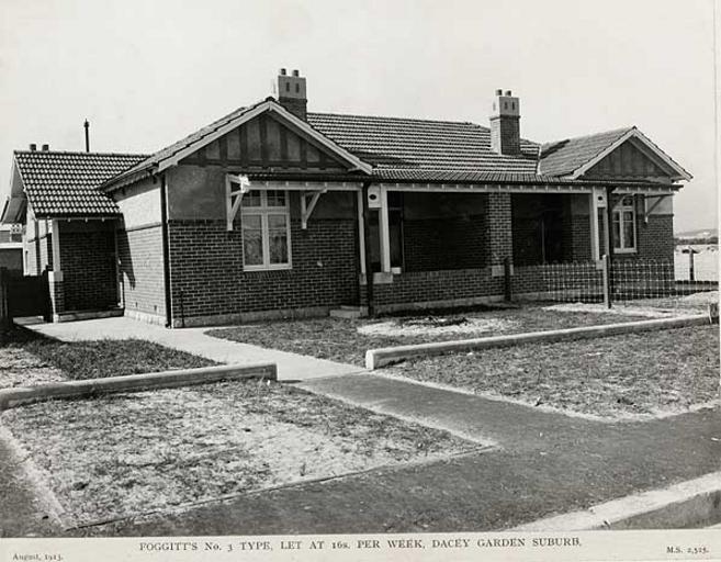 | Keywords: archives state records nsw staterecordsnsw newsouthwales blackandwhite daceyville suburb garden suburb gardensuburb sydney houses federation style federationstyle public housing publichousing outdoor building architecture black and white Foggit's No.3 Type let at 16s [shillings] per week, Dacey Garden suburb Dated: 1913 Digital ID: 5225_a018_a018000029 Rights: www.records.nsw.gov.au/about-us/rights-and-permissions We'd love to hear from you if you use our photos. From a series of photographs of 'Dacey Garden Suburb' (Daceyville) - a development by the Housing Board of NSW as Sydney's "first planned modern garden suburb". Daceyville was developed between 1913 and 1918 and is located in south-eastern Sydney within the municipalities of Mascot and Botany. The images in the series show scenes of the area before development, road building, the types of houses built, shops, as well as the Public School. The suburb was named after the state parliamentarian John Rowland Dacey who played a vital role in the approval of this urban development. Many other photos in our collection are available to view and browse on our website using Photo Investigator. Foggit's No.3 Type let at 16s [shillings] per week, Dacey Garden suburb Dated: 1913 Digital ID: 5225_a018_a018000029 Rights: www.records.nsw.gov.au/about-us/rights-and-permissions We'd love to hear from you if you use our photos. From a series of photographs of 'Dacey Garden Suburb' (Daceyville) - a development by the Housing Board of NSW as Sydney's "first planned modern garden suburb". Daceyville was developed between 1913 and 1918 and is located in south-eastern Sydney within the municipalities of Mascot and Botany. The images in the series show scenes of the area before development, road building, the types of houses built, shops, as well as the Public School. The suburb was named after the state parliamentarian John Rowland Dacey who played a vital role in the approval of this urban development. Many other photos in our collection are available to view and browse on our website using Photo Investigator. |
