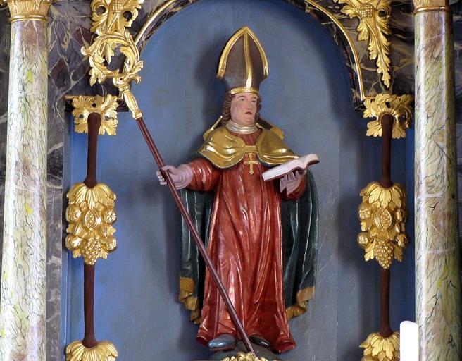 Keywords: Dachstein StMartin 048.JPG Alsace Bas-Rhin Dachstein Eglise Saint-Martin Maître-autel vers 1700 Statue de St-Materne own 2012 Ralph Hammann Taken with Canon PowerShot SX20 IS Photographs of Dachstein by Ralph Hammann Maître-autel de l'église Saint-Martin de Dachstein Baroque statues in Bas-Rhin Wooden statues in Bas-Rhin 18th-century statues in Alsace 1700 statues in France Statues of Christian saints in Alsace Religious statues in Bas-Rhin Statues of Saint Maternus of Cologne Cc-zero |