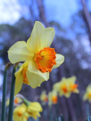 Keywords: daffodils yellow blooms blossoms blooming petals fleurs floral spring flowering plants ornamental blue background