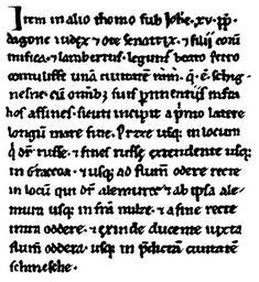 Keywords: DagomeCambraiCopy.jpg This picture contains a copy of latin text which you can find in medieval codex from second half of 12 century look at Source It's written by transalpine early gothic minuscule or lately carolinian minuscule with gothic elements except first I one from unical For more information see below This copy has been done by pencil HP Photosmart C3180 scaned and MS Paint That's why this copy is not exact but very similar only Codex from Biblioteque Municipale in Cambrai Ms lat 554 f 121<sup>v</sup> Copy was created 2007-02-07 Guncelin Expired Kürbis B Dagome iudex - studium krytyczne PoczÄ…tki paÅ„stwa polskiego KsiÄ™ga tysiÄ…clecia ed K Tymieniecki vol I PoznaÅ„ 2002 reprint ilustration 82 page 377; There is a photo which was taken in 60's by Polska Akademia Nauk <table cellpadding 6> <tr> <td width 269 align center >Latina</td> <td width 271 align center >English</td> <td width 269 align center >Polski</td> </tr> </table> <table cellpadding 6> <td width 272 align justify valign top >Item in alio thomo sub Iohanne ¢ XV ¢ papa ¢ dagone iudex et Ote Senatrix ¢ et filii eorum misica ¢ et lambertus ¢ leguntur beato Petro contulisse unam civitatem in integrum ¢ que ¢ est ¢ schig-nesne ¢ cum omnibus suis pertinentiis infra hos affines ¢ sicuti incipit a primo latere longum mare fine ¢ Przze usque in locum qui dicitur russe ¢ et fines russe extendente usque in Graccoa ¢ et usque ad flumen odere recte in locum qui dicitur alemure; et ab ipsa ale-mura usque intra milze ¢ et afine recte intra oddere ¢ et exinde ducente iuxta flumen oddera ¢ usque in predictam civitatem schinesche ¢</td> <td width 273 align justify valign top >Also in another volume under reign of pope John XV we read that Dagone lord and Ote lady and their sons Mieszko and Lambert were due to grant to saint Peter one entire city or state which is called Schignesne with all its lands in those borders as it begin from first side by cost of the long sea and from there along border of Prussia to the place which is called Rus and straight along border of Rus till Kraków and then till the Oder river straight to the place which is called Alemura and from this Alemura till the land of Milsko and from its border straight under the Oder and from there along the Oder river till mentioned city or state of Shinesche </td> <td width 272 align justify valign top >Podobnie w innym tomie za Jana XV papieża czytamy że Dagome pan i Ote pani i synowie ich Mieszko i Lambert mieli nadać Å›wiÄ™temu Piotrowi w caÅ‚oÅ›ci jedno miasto lub paÅ„stwo które zwie siÄ™ Schignesne z wszystkimi jego przynależnoÅ›ciami w tych granicach tak jak siÄ™ zaczyna od pierwszego boku dÅ‚ugim morzem stÄ…d granicÄ… Prus aż do miejsca które siÄ™ nazywa RuÅ› a granica Rusi ciÄ…gnÄ…c aż do Krakowa a potem aż do rzeki Odry prosto do miejsca które zwie siÄ™ Alemura a od tejże Alemury aż po ziemiÄ™ Milsko a od jego granicy prosto pod OdrÄ™ i stÄ…d prowadzÄ…c wzdÅ‚uż rzeki Odry aż do rzeczonego miasta lub paÅ„stwa Schinesche </td> </tr> </TABLE> ---- This text was copied especially for one paragraph 7th on folia 121<sup>v</sup> which is mainly known as Dagome Dagone iudex This is a piece of canonical work called Collectio canonum The reason is that it is a very important text for polish history where it's used to fixing many things from the erliest times of Poland However we don't know how it looked oririginally and we have only six different copies of that you can see copy number 4 on the picture That's why there are many studies which tries to deduce real appearance of this by copies comparision Very important thing is dependence between copies and which one has delivered the best forms Here is a filiation diagram where copy on the picture is marked by blue; - 10 2 <center> 6 Codex from Vatican Library<br/>Liber Censuum<br/>Cod Vatic lat 8496; 2 2 <center> 5 Codex from Vatican Library<br/>Codex Ottobonianus<br/>Ms lat 3057; - 11 4 style border-bottom 1px black solid; border-left 1px black solid; border-left 1px black solid; - 13 2 style border-left 1px black solid; - 8 ABF2FF colspan 2 <center> 4 Codex from Municipal Library of Cambrai<br/>Codex Cameracensis<br/>Ms lat 554; 2 2 <center> Albinus bishop of Albano<br/>Gesta Albini<br/> between 1185 and 1198 lost; - 8 border-right 1px black solid; 4 style border-bottom 1px black solid; border-right 1px black solid; - 2 <center> 1 Codex from Vatican Library<br/> Cod Vatic lat 3833; 2 <center> 2 Codex from Vatican Library<br/> Cod Vatic lat 1984; 1 2 <center> 3 Codex from National Library of France<br/> Ms lat 1458; 4 3 style border-left 1px black solid; - border-right 1px black solid; 2 style border-bottom 1px black solid; border-right 1px black solid; 3 style border-bottom 1px black solid; border-right 1px black solid; center 4 2 <center> Benedict canon<br/>Liber Politicus<br/> between 1140 and 1143 lost; - 3 style border-right 1px black solid; 8 style border-bottom 1px black solid; 3 style border-left 1px black solid; - 8 style border-right 1px black solid; 7 - 7 14 7 14 7 14 7 14 7 14 7 14 7 14 7 14 7 14 7 14 7 14 7 14 7 14 7 14 - width 100 ; text-align center; vertical-align top; cellspacing 0 cellpadding 0 - style vertical-align top; 2 style vertical-align middle; Deusdedit cardinal<br/>Collectio canonum<br/> about 1087 lost;<br/>Dagome iudex<br/>in original; 2 - Dagome Iudex |