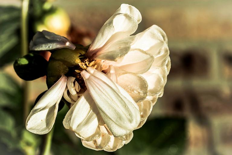 Keywords: dahlia bright flower blossom bloom faded flower faded falling petals wet dew dewdrop withered nature