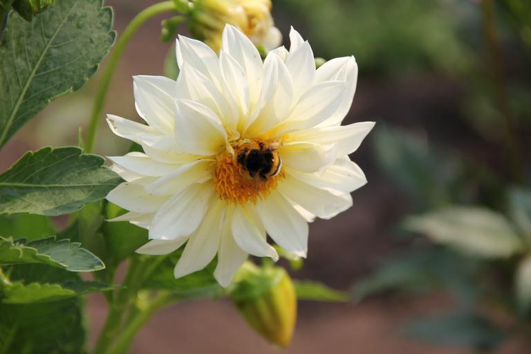 Keywords: dahlia flower white blossom bumblebee petals