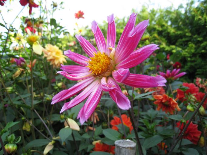 Keywords: dahlia pink flowers garden summer sky blue colors