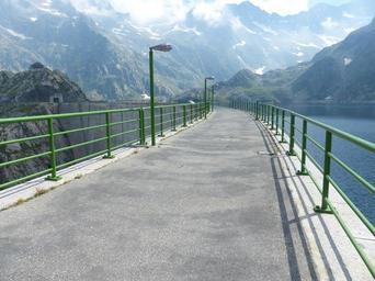 Keywords: dam energy generation reservoir mountains enormous huge stone bridge lantern railing outlook lago del chiotas road trail gta