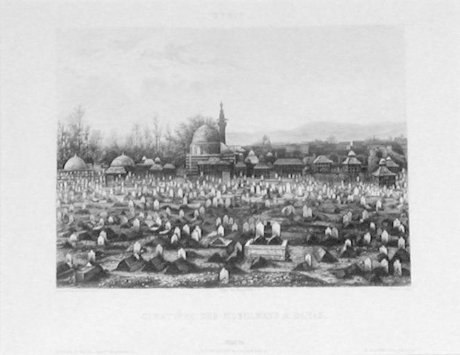 Keywords: Damas Muslim cemetery 1839.jpg en Engraving of one of the first photographs of the Muslim cemetery of Damascus Taken by Gaspard-Pierre-Gustave Joly de Lotbinière in March 1840 Engraved by Weber Published in Excursions daguerriennes by Noël Paymal Lerebours in 1841 fr Gravure d'une des premières photographies du cimetière musulman de Damas Prise par by Gaspard-Pierre-Gustave Joly de Lotbinière en mars 1840 Gravée par Weber Publiée dans Excursions daguerriennes par Noël Paymal Lerebours en 1841 <br /><br />Extraits du texte d'accompagnement publié dans Excursions daguerriennes rédigé par Pierre-Gustave Joly ce texte est dans le domaine public comme l'image <br /><br />« Cette planche ne représente qu'une faible partie du cimetière de Damas La mosquée qui domine au centre est le tombeau d'un prince ; ces cages grillées entourent et protègent les tombes des riches ; ces nombreuses pierres tumulaires marquent la dernière demeure des pauvres et sont souvent foulées sous les pieds des passants Dans le lointain on aperçoit l'Anti-Liban » Uploaded by Mireime Photographer Pierre-Gustave Joly 1798-1865 Engraver Weber 1840-03 50px PD-1923 PD-old-100 Pre 1900 Damascus Damascus in the 19th century Bab Saghir Islamic cemeteries Daguerreotypes Gaspard-Pierre-Gustave Joly de Lotbinière 1840 photographs 1841 engravings |