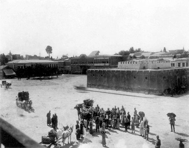 Keywords: Damascus-13.jpg السجن في ساحة المرجة شارلز سكوليك 1894 Marjeh Square Marjah Damascus by Charles Skolec 1894 mechanical reproduction of 2D work 1894 Charles Skolec PD-old Pre 1900 Damascus