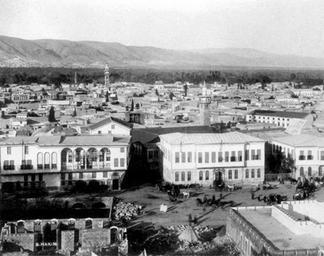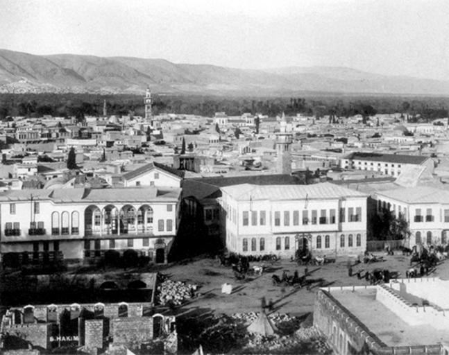 Keywords: Damascus-30.jpg بناء البريد في ساحة المرجة سليمان الحكيم 1898 PD-old Pre 1900 Damascus