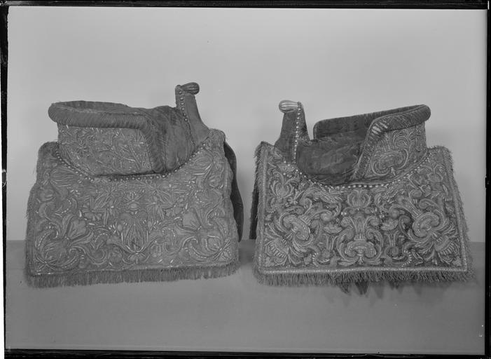 Keywords: Damsadel, 1650, broderad i Frankrike, monterad i Sverige - Livrustkammaren - 27665.tif LSH artwork sv Damsadel av blå sammet med yttäckande broderi av rankor och voluter med guld- och silvertråd Rektangulära kappor fodrade med mörkbrunt läder och kantade med frans av guld och silvertråd Sitsen till största delen omsluten av en 145 mm hög bom på utsidan med stoppad vulstformig kant Sitsen bommens insida och kanten stickade med tvinnad guld- och silvertråd Hög sadelknapp utan broderi överst framåt utdragen rundad räfflad av förgyllt silver Sitsen utanför bommen kantad med tännlickor av förgyllt silver Bom klädd med näver Lös rundad kudde att lägga framför sadelknappen som stöd för högerbenetTre stroppar för sadelgjord av brunt läder fodrade med vitt läder En skinnklädd sölja för stigläder Två söljor för förbygel en sölja för svansrem alla av stål och med löphylsa original caption 1650 silver - velvet Färg blå material sammet - leather - gold thread size mm 630 size mm 340 sits size mm 570 size mm 600 LRK Kristina av Sverige Christina drottning av Sverige 1966 Königin Christina 1997-1998 Osnabrück Äktenskap kärlek och barnafödande - 1600-talets kvinnoroll 2000 Hästen 2003-2004 Utst Schwedenzeit in Pommern staden Wolgasts 750-årsjubileum 2007 Trofast - hov och tass i kunglig tjänst 2010-2011 Livrustkammaren Trogna vänner - Kungliga hästar och hundar 2011-2012 Museiverket/Finlands nationalmuseum Utbyteslån av föremål från Drottning Kristina i samband med inlån av begravningsregalier till Livrustkammarens utställning Dödens teater 2015-2016 Strängnäs domkyrka place of origin SE Monterad FR Broderad original filename LN_B16943_019823 45535 inventory number LRK 9000 27665 CC0 Damsadel 1650 broderad i Frankrike monterad i Sverige - Livrustkammaren - 27665-negative tif <gallery caption Different images of same object > File Damsadel 1650 broderad i Frankrike monterad i Sverige - Livrustkammaren - 19103 tif File Damsadel korgstigbygel - Livrustkammaren - 76412 tif File Damsadel 1650 broderad i Frankrike monterad i Sverige - Livrustkammaren - 11289 tif File Damsadel Frankrike - Livrustkammaren - 76985 tif </gallery> <gallery caption Related objects > File Stigbygel Vasavapnet - Livrustkammaren - 68591 tif LRK 6333 File Stigbygel - Livrustkammaren - 51380 tif LRK 6333 </gallery> Saddles Media contributed by LSH dim-with multiple size templates Media contributed by LSH 2016-12 |