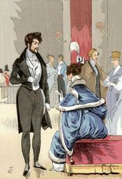 | Keywords: Dandyism in the Romantic period - a ballroom in 1834.jpg Artwork The gentleman is wearing tight fitting pants that are lighter than his coat His pants have boot straps as well reminiscent of an English riding costume He wears a short-waisted coat with basques or tails à l'anglaise or longer tails In his hand he carries a haut-de-forme or top-hat He is dressed rather somberly reminiscent of the spirit of the 'spleen' during the Romantic Period The woman seated in front of the man wears a fur-trimmed blue dress and a white feather in her hair Abstract source Boucher François 20 000 Years of Fashion New York Harry N Abrams Inc 1967 1898 1 colored plate 10 x 15 cm Institution Brown University Library object history exhibition history credit line accession number 1150467184856208 PD-old-100 19th-century people of Paris Ballrooms in Paris Females with blue dresses in art Fur garments in art Images of Paris from the Brown University Library Les modes de Paris 044 Fashion plates depicting men People of France in 1834 Dandies 1830s dresses Fur fashion in 1834 |