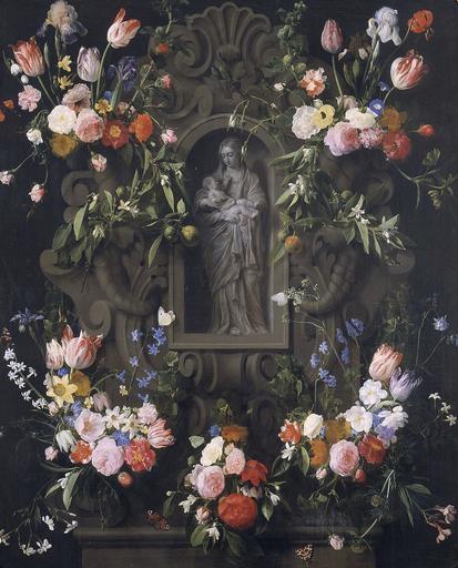 Keywords: Daniel Seghers Garland with Virgin 1645 paid with gold maulstick 1646.JPG Artwork Q17275908 Creator Daniël Seghers and Creator Thomas Willeboirts Bosschaert title Garland of flowers with a sculpture of the Virgin Mary Bloemencartouche met Mariabeeld 1645 oil canvas cm 151 122 7 Institution Mauritshuis The Hague accession number 256 object history credit line bottom right D Seghers Soctis Jesu 1645 LangSwitch Garlands by Daniël Seghers Virgin by Thomas Willeboirts Bosschaert Cartouche door Daniël Seghers Madonna door Thomas Willeboirts Bosschaert object history Presented to Frederick Henry Prince of Orange in 1645 In return in 1646 Frederick Henry presented a golden maulstick made by goldsmith Hans Coenraad van Brechtel to the Jesuits of which Daniël Seghers was a member Constantijn Huygens secretary to Frederick Henry also wrote a poem in thanks and oversaw exchange The maulstick is now lost but a copy was made ca 1724-1750 see image Own PD-old-100 LangSwitch Notes Noten <references /> Thomas Willeboirts Bosschaert Garland paintings by Daniël Seghers 1645 Flemish paintings in the Mauritshuis Constantijn Huygens Baroque still life paintings of flowers Garland paintings by Daniël Seghers Paintings by two artists |