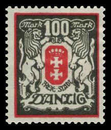 Keywords: Danzig 1922 128 großes Staatswappen.jpg / Briefmarkenbeschreibung Dauermarkenserie Definitive stamp series Ausgabepreis 100 Mark First Day of Issue / Erstausgabetag 14 Dezember 1922 Michel-Katalog-Nr 128 Danzig scanned by NobbiP 2011-09-30 Buchholz PD-old-auto-1996 1944 PL Max Buchholz German stamps review keep <gallery> File Danzig 1922 123 Wappen jpg 1922 123 File Danzig 1922 108 Wappen jpg same motife and color 1923 124 <br />1922 108 File Danzig 1922 109 Wappen jpg same motife and color 1923 A124 <br />1922 109 File Danzig 1923 125 Wappen jpg 1923 125 File Danzig 1922 111 Wappen jpg same motife and color 1923 126 <br />1922 111 File Danzig 1922 127 großes Staatswappen jpg 1922 127 File Danzig 1923 129 großes Staatswappen jpg 1923 129 </gallery> Philately großes Staatswappen mit 2 flankierenden Löwen Nennwert 100 Mark 1922-12-14 Buchholz 3 935 600 Buchdruck 128 Danzig Coats of arms of Gdańsk on stamps 1922 stamps of the Free City of Danzig 1922 stamps |