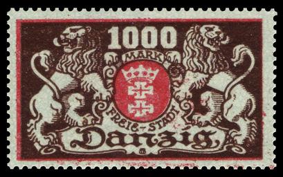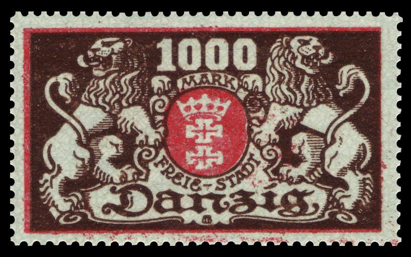 Keywords: Danzig 1923 121 großes Staatswappen.jpg / Briefmarkenbeschreibung Dauermarkenserie Definitive stamp series Ausgabepreis 1000 Mark First Day of Issue / Erstausgabetag 24 Januar 1923 Michel-Katalog-Nr 121 Danzig scanned by NobbiP 2011-09-30 Buchholz PD-old-auto-1996 1944 PL <gallery> File Danzig 1923 119 großes Staatswappen jpg 1923 119 File Danzig 1923 120 großes Staatswappen jpg 1923 120 File Danzig 1923 122 großes Staatswappen jpg 1923 122 </gallery> Philately großes Staatswappen mit 2 flankierenden Löwen Nennwert 1000 Mark 1923-01-24 Buchholz 768 100 Buchdruck 121 Danzig Coats of arms of Gdańsk on stamps 1923 stamps of the Free City of Danzig German stamps review keep Max Buchholz |