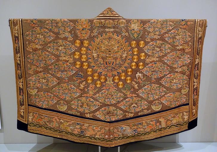 Keywords: Daoist priest's robe (jiangyi), China, Qing dynasty, late 18th to early 19th century AD, silk, metal-wrapped silk, view 1 - Textile Museum, George Washington University - DSC09658.JPG en Exhibit in the Textile Museum George Washington University Washington DC USA Photography was permitted in the museum without restriction This work is old enough so that it is in the public domain 2015-03-26 15 36 25 own Daderot other versions PD-old-70 cc-zero Textiles of China in the Textile Museum George Washington University Clothing of the Qing Dynasty Taoist clothing |